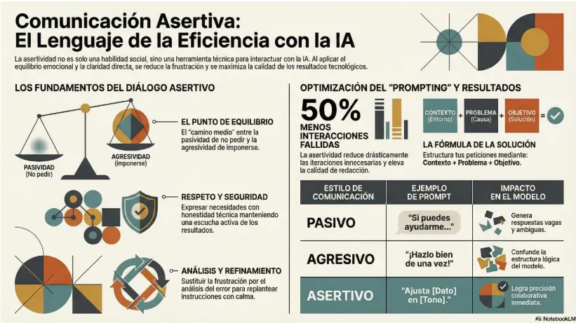 ¿Sabías que la comunicación asertiva reduce hasta un 50% las interacciones fallidas con la IA? No es solo qué pides, sino cómo lo pides: